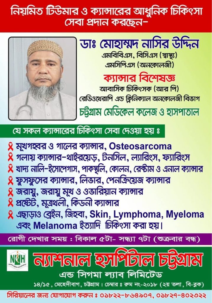 Dr. Mohammad Nasir Uddin is a dedicated and compassionate Oncology Specialist based in Chittagong, Bangladesh, with over seven years of experience in cancer care. His mission is to provide personalized, evidence-based treatment to patients battling cancer, with a focus on dignity, hope, and healing.